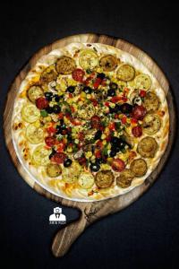 بادمجان، گوجه فرنگی، قارچ، ذرت، فلفل دلمه، زیتون، پنیر میکس، سس گوجه فرنگی