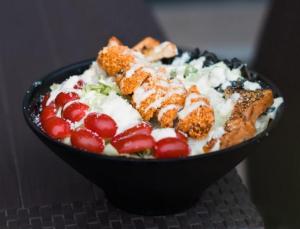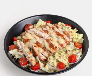 کاهو پیچ + گوجه گیلاسی + پودر گردو و جعفری + مرغ گریل + سس آنتروکوت فرانسه