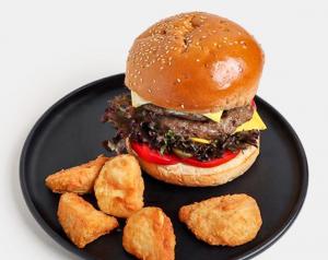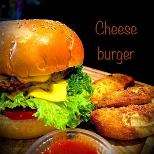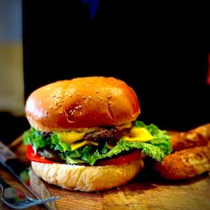 برگر دست ساز، سینه مرغ گریل، پنیر گودا، کاهو، خیارشور، گوجه، سس مخصوص