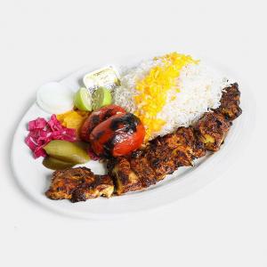 یک سیخ جوجه کباب سینه مرغ 250 گرمی، دورچین: لیموترش، فلفل کبابی، یک عدد گوجه کبابی، پیاز جعفری، ترشی کلم قرمز، نان سنگک