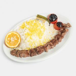 یک سیخ کباب برگ گوشت فیله گوساله 200 گرمی، یک سیخ کباب کوبیده گوشت مخلوط گوساله و گوسفندی 120 گرمی، 350 تا 380 گرم برنج ایرانی، دورچین: لیموترش، فلفل کبابی، یک عدد گوجه کبابی، پیاز جعفری