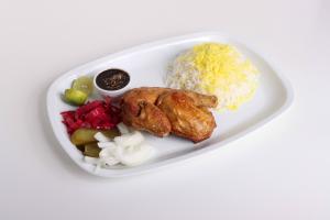یک تکه ران سس پز شده 400 گرمی مرغ،350 تا 380 گرم برنج ایرانی،دورچین،لیمو،خیارشور، پیاز، کلم