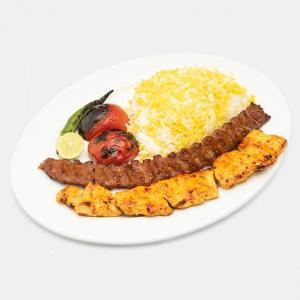 یک سیخ جوجه کباب سینه مرغ 180 گرمی، گوشت مخلوط گوساله و گوسفندی 100 گرمی،350 گرم برنج ایرانی، دورچین: لیموترش، یک عدد گوجه کبابی، پیاز، ترشی کلم قرمز