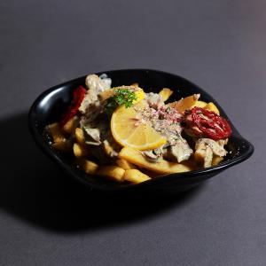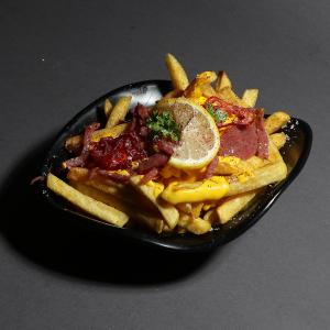 180 گرم گوشت چرخ شده، کاهو، گوجه، خیارشور، فلفل هالوپینو، سس چیلی سیب زمینی