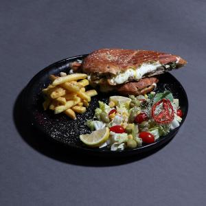 180 گرم گوشت چرخ شده، ژامبون گوشت، کاهو، گوجه، خیارشور، پنیر موزارلا قارچ، سیب زمینی