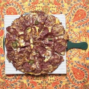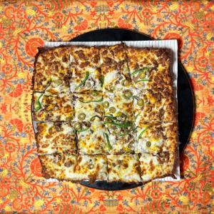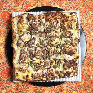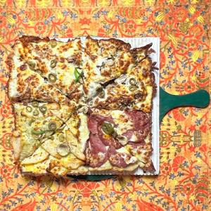ماهیچه گوساله + زبان گوساله + پنیر پیتزا مخصوص + فلفل دلمه + قارچ + زیتون + سس ماشروم