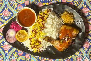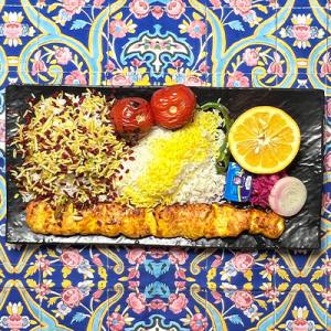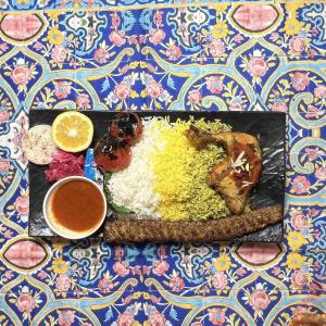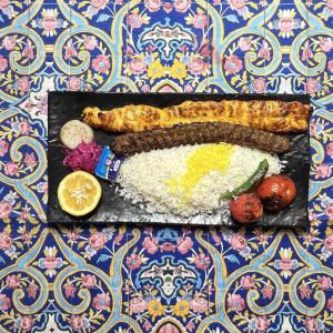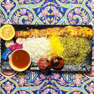یک سیخ برگ گوساله تازه و یک سیخ جوجه ویژه زعفرانی به همراه برنج ایرانی و دورچین ویژه