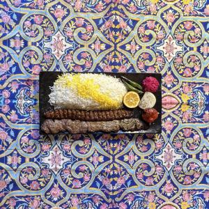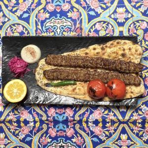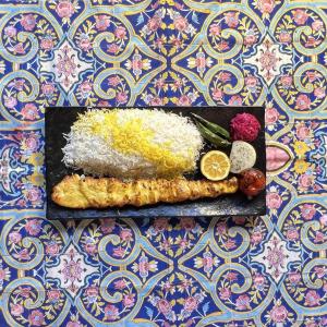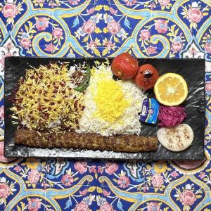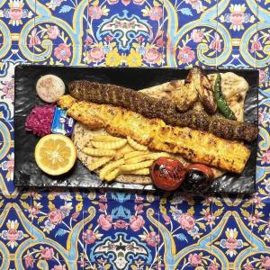 یک سیخ برگ گوساله تازه و یک سیخ جوجه ویژه زعفرانی به همراه نان سنگک تنوری و دورچین ویژه