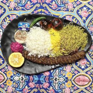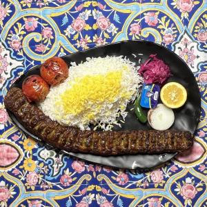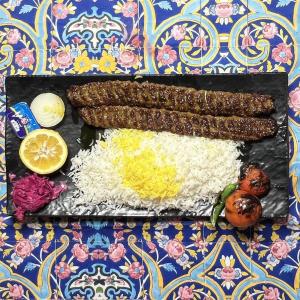 یک سیخ برگ گوساله تازه و یک سیخ کوبیده زعفرانی ویژه در کنار برنج ایرانی و دورچین