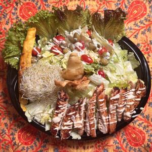 2 عدد مرغ گریل برشته با پنیر پارمسان، سرو شده در نان ترتیلا، همراه با کاهوی تازه، سس سزار کلاسیک، گوجه گیلاسی و زیتون