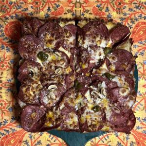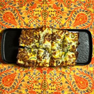پنیر پیتزا مخصوص + زیتون + قارچ + فیله و راسته گوساله طعم دارشده + فلفل دلمه ای