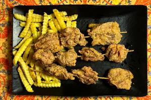 سه سیخ چوبی سان بروستد ران ویژه 350 گرمی، سرو شده با دورچین مخصوص، نان برگر تازه و سیبزمینی سرخکرده