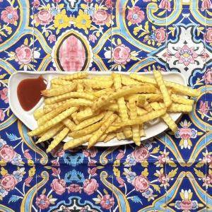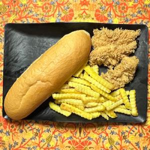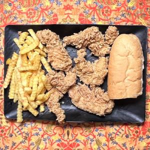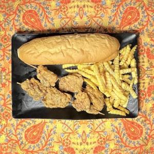 پنج عدد فیله استریپس ویژه طلایی، همراه با سیبزمینی سرخکرده و نان گرد تازه