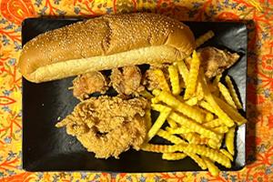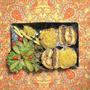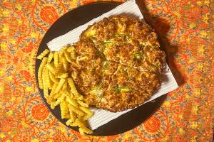 فیله سوخاری طلایی ،پنیر ویژه کش دار ،سس مخصوص به همراه سیب زمینی سرخ کرده مخصوص