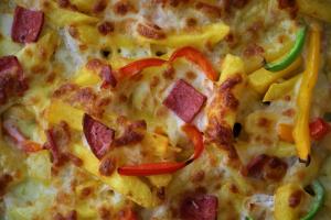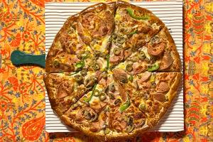 پنیر پیتزا مخصوص + ژامبون مخلوط + سس ویژه + قارچ + فلفل دلمه