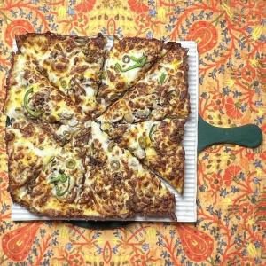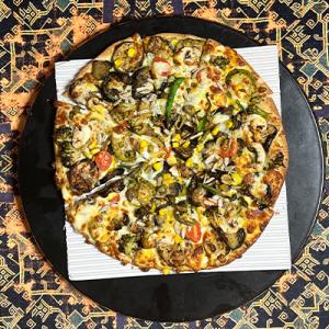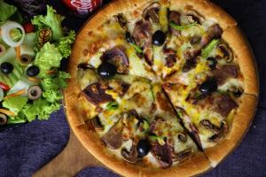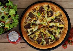 پنیر پیتزا مخصوص + ماهیچه وسردست گوساله + قارچ + زیتون + فلفل دلمه ای + سس ویژه