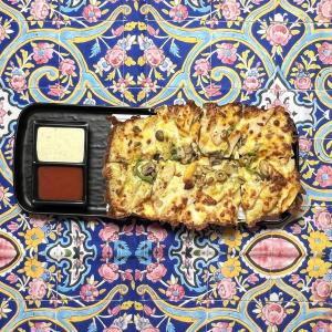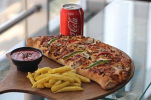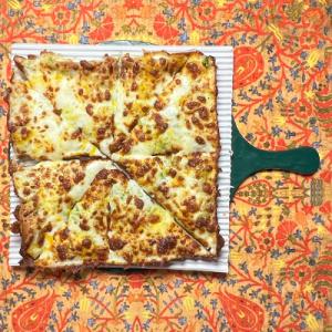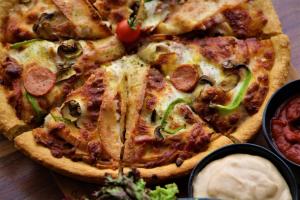 پنیر پیتزا مخصوص + زیتون + قارچ + فیله و راسته گوساله فراوری شده + فلفل دلمه ای+سس سیر ویژه