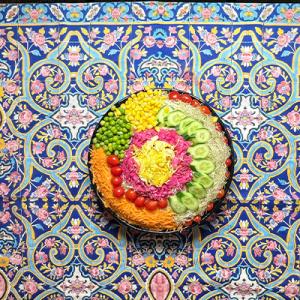سالاد کاهو و کلم با ترشی کلم، جوانه ماش، گوجه گیلاسی، کلم زعفرانی، هویج، خیار، ذرت، نخود سبز و لوبیا