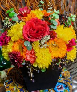 ترکیبی از گل رز و کرزنتیا، میخک، آفتابگردان،