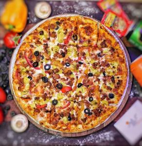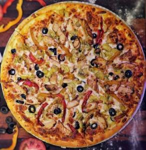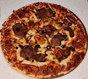 گوشت گوساله، سس سیر، فلفل دلمه ای، زیتون، قارچ