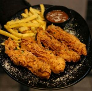 شنیسل مرغ مزه دار شده ، قارچ ، پنیر گودا ، سس مخصوص پنینی ، سیب زمینی)