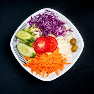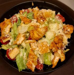 کاهو، مرغ سوخاری، نان کروتان، گوجه گیلاسی، سس سزار، پنیر پارمزان