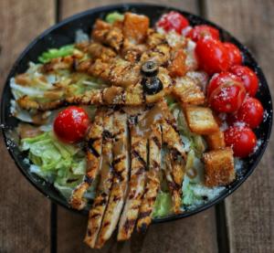 کاهو، مرغ گریل، نان کروتان، گوجه گیلاسی، سس سزار، پنیر پارمزان