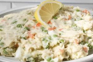 سیب زمینی آب پز۲۰۰ گرم + گوشت سینه مرغ پخته شده ۵۰ گرم +تخم مرغ آب پز ۲ عدد +خیار شور +نخود فرنگی+ سس مایونز + ادویه