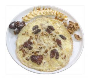 ترکیب خرما و تخم مرغ با شیره انگور به همراه دورچین خرما و گردو ،نان