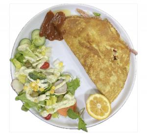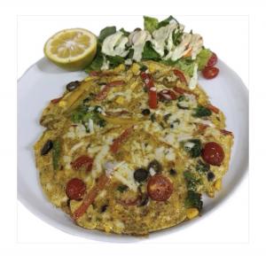 یک لایه تخم مرغ ،ترکیب ژامبون و قارچ و فلفل دلمه و گوجه گیلاسی ،زیتون،دورچین ،نان
