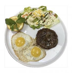 دو عدد تخم مرغ ،یک عدد برگر دست ساز،دورچین ،نان