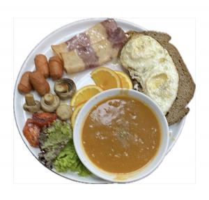 لوبیا،تخم مرغ،سوسیس،بیکن،قارچ و گوجه ،نان