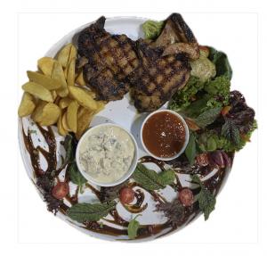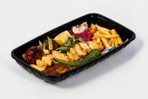شنسل مرغ200گرم،یک سیخ کوبیده130گرم،فیله گوسفندی130گرم،قارچ150گرم،برنج ایرانی450گرم،گوجه کبابی،لیموترش،ته چین،خیارشور،پیازجعفری،ترشی کلم،فلفل کبابی،کره