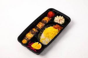 یک سیخ کوبیده 250 گرمی به همراه برش های جوجه(کباب نگینی) سیب زمینی ،نارنج،ترشی کلم ،خیار شور و نان بسته بندی