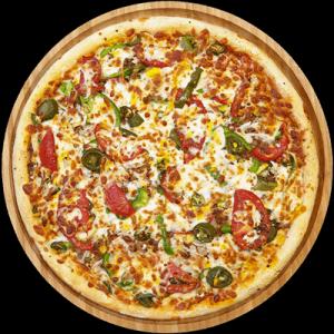 خمیر پیتزا آمریکایی، پپرونی، گوشت چرخ کردە، فیلە سینە مرغ کبابی تکە ای، ژامبون 70%، فلفل دلمه، گوجه، ذرت، قارچ، پنیر پیتزا