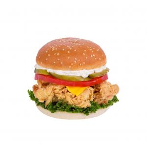 3 تکه فیله مرغ سوخاری، پنیر موزارلا، خیارشور، گوجه، کاهو، سس مخصوص، نان باگت
