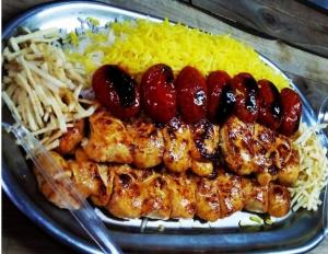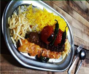 یک سیخ جوجه 250 گرمی + یک سیخ کوبیده 120 گرمی + 400 گرم برنج پخته + گوجه کبابی+لیمو
