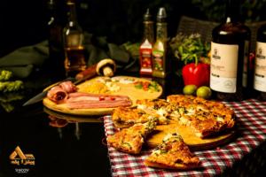 گوشت چرخ کرده، ژامبون، فلفل دلمه، قارچ، سس تند، پنیر