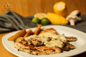 سینه مرغ، قارچ، فلفل دلمه، گوجه فرنگی، پیاز، پنیر، سس مخصوص
