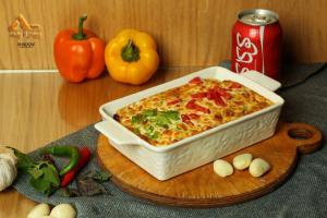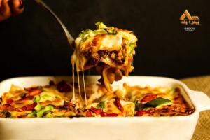 گوشت چرخ کرده، بادمجان، گوجه فرنگی، فلفل دلمه، روغن سیر، پنیر پیتزا