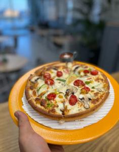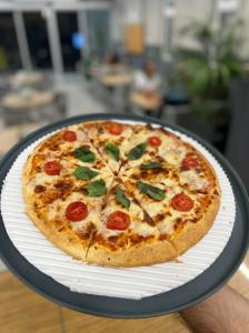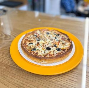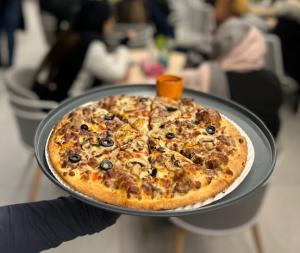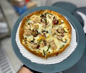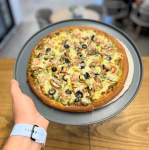 نان پیتزا قطر۲۶ سانتی متر ـ گوشت فیله ی گوساله ی چرخشده - میکس ژامبون گوشت و مرغ ۹۰٪ - فلفل دلمه ای رنگی - قارچ - زیتون - گوجه گیلاسی - سس مارینارا - پنیر موزارلا