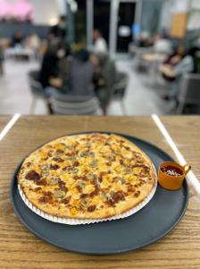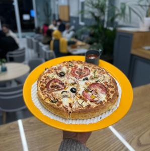 نان پیتزا قطر33 سانتی متر ـ گوشت فیله ی گوساله ی چرخشده - میکس ژامبون گوشت و مرغ ۹۰٪ - ذرت -فلفل دلمه ای رنگی - قارچ - زیتون - گوجه گیلاسی - سس مارینارا - پنیر موزارلا
