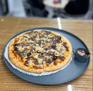 گوشت گوسالع تکه ای _ فیله مرغ طعم دار شده _ زیتون سبز _ گوجه گیلاسی _ فلفل دلمه رنگی _ قارچ _ سس مخصوص _ پنیر موزارلا
