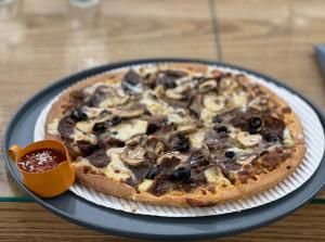 گوشت استیک - فلفل دلمه-قارچ-زیتون سیاه-سس سیر-پنیر موزارلا