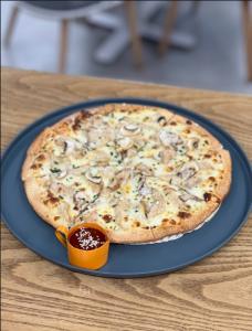 فیله مرغ طعم دار شده، قارچ، زیتون سیاه،جعفری خرد شده، پنیر موزارلا، سس آلفردو-پنیر پارمسان