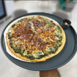 فیله مرغ طعم دار شده، قارچ، زیتون سیاه، فلفل رنگی، پنیر موزارلا، سس سس پستو