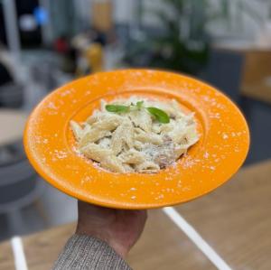 فیله مرغ طعم دار شده ، قارچ، پنه، پنیر پارمسان، سس سیر، سس آلفردو