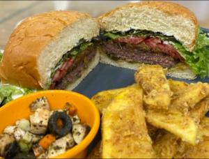 گوشت گوساله تکه ای_سیب زمینی خلالی _ پیازچه-زیتون سیاه_گوجه گیلاسی_فلفل دلمه-پنیر موزارلا