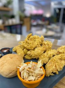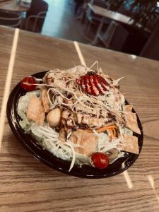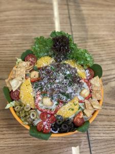 کاهوپیچ، فیله مرغ سوخاری ـ نان پیتا ـ نان کراتان سیر دار ـ پنیر پارمسان، گوجه گیلاسی، زیتون سیاه و سبز
