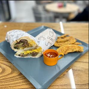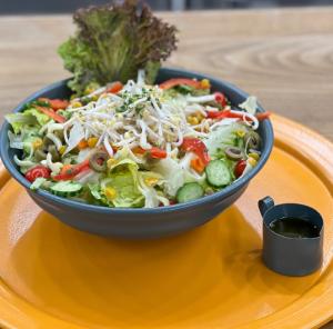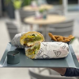 کاهو پیچ -خیار-هویج-سس بادام زمینی-زیتون-پنیر دودی -نان پیتا ـ سینه مرغ